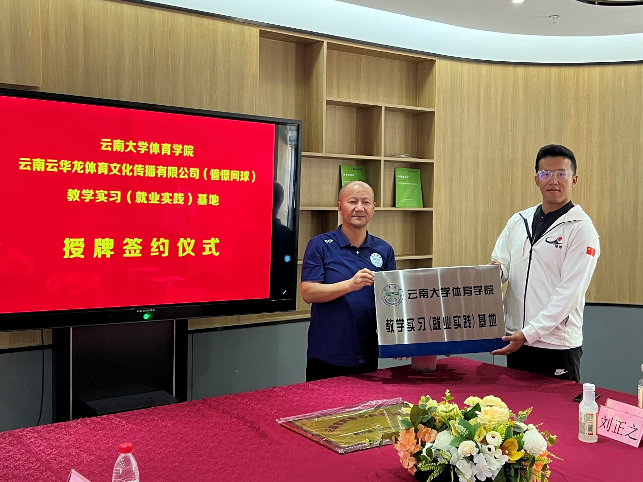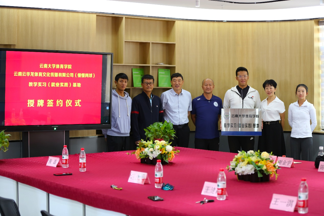 7月17日,pp电子官方网站与云南云华龙体育文化传播有限公司(憧憬网球)共建“教学实习(就业实践)基地,在昆明憧憬网球俱乐部937校区完成签约和授牌仪式,双方将在云南网球教练员的教学实习、就业实践等方面展开合作。