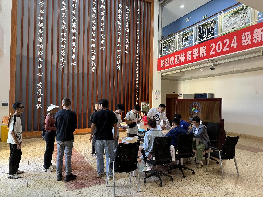 报道现场,迎新志愿者和老师们井然有序地进行新生信息核查登记、材料接受、物品发放,并组织新生在新生签名板上签字拍照留念,相互配合确保迎新工作的顺利开展。