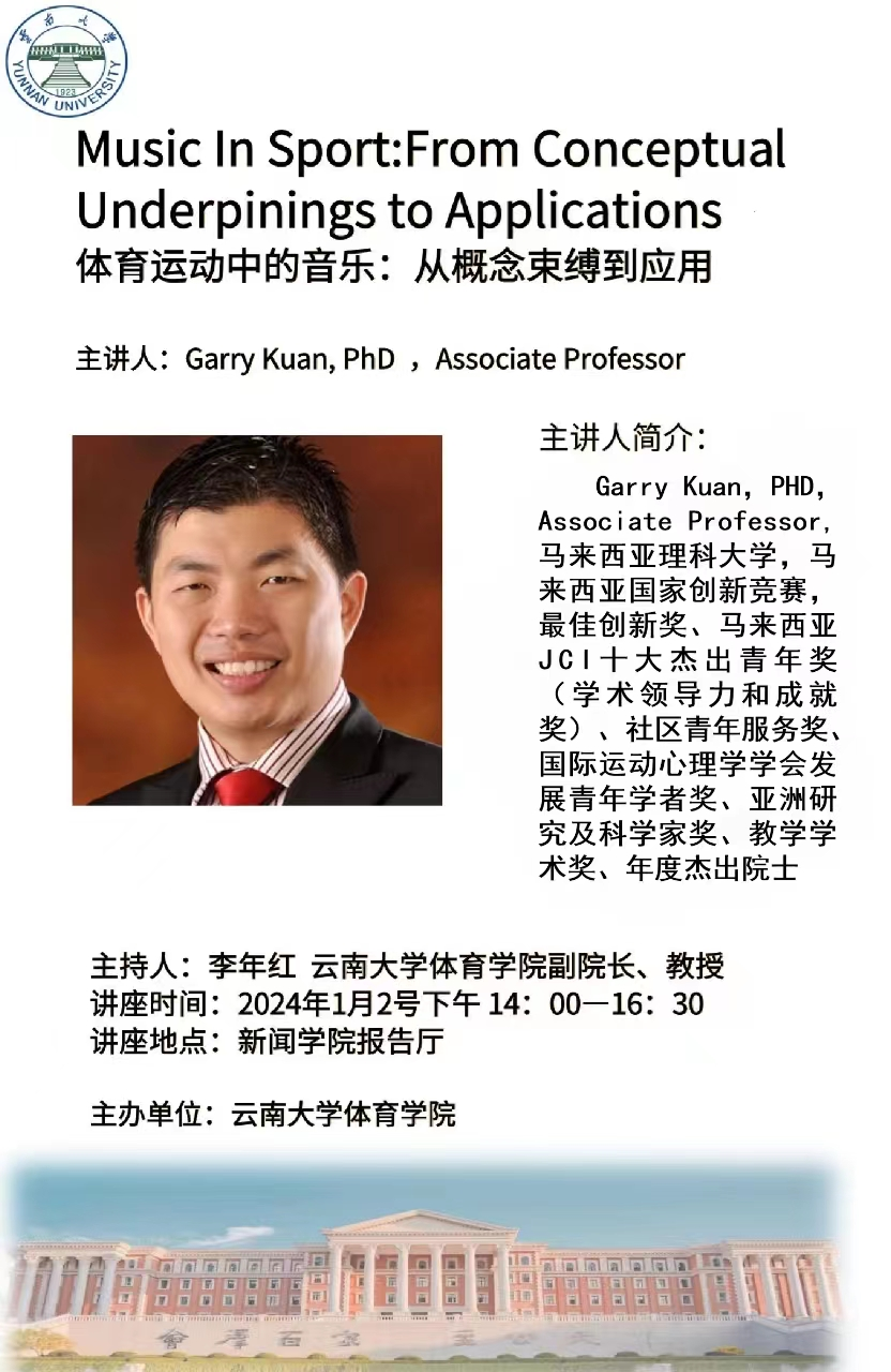 在2024年1月2日,pp电子官方网站荣幸地邀请到了马来西亚理科大学杰出学者Garry Kuan教授,为学院研究生带来了一堂深度的学术课程。教授以独特的视角,引领学生们重新认识和理解体育,深度挖掘体育运动中音乐的无穷魅力。