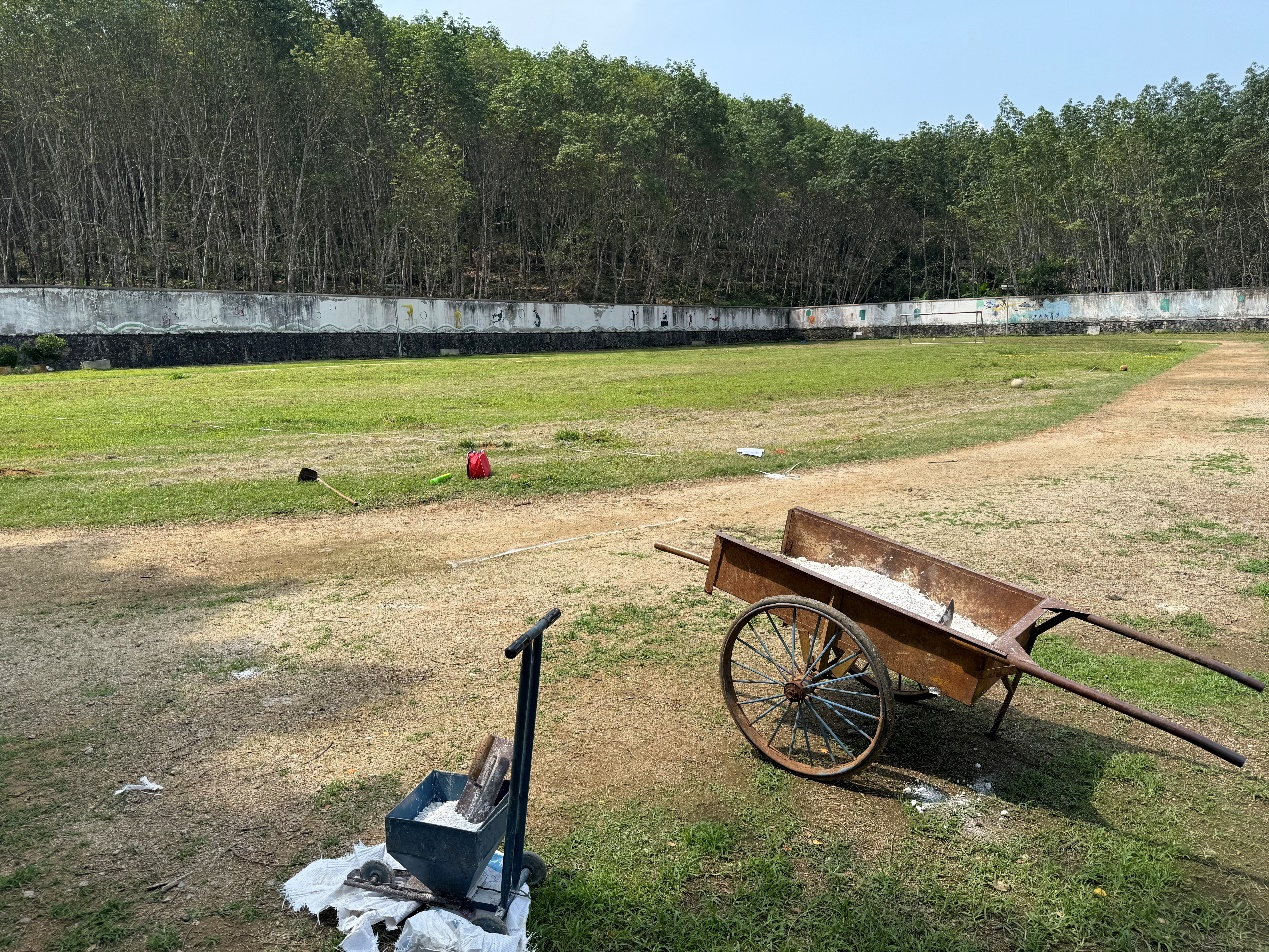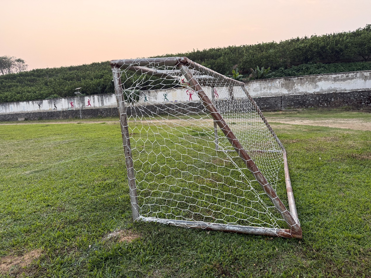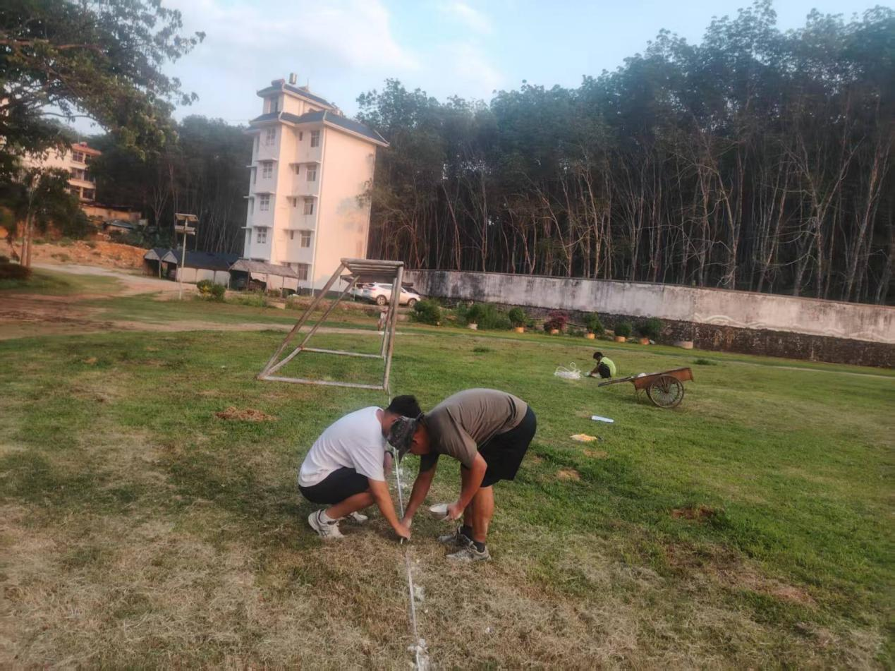 pp电子官方网站作为云南省首批参与“体育美育浸润行动计划”高校之一,自2023年起持续选派pp电子官方网站师生赴边疆地区开展对口帮扶。今年3月,两名pp电子官方网站第四批浸润计划成员(罗晓龙、李吉泰)进驻勐龙镇小街九年一贯制学校,针对校园体育设施匮乏的难题展开攻坚。然而,受限于场地条件,该校长期缺乏专业体育设施,一片杂草丛生的荒地成为师生们心中的遗憾。每次体育课,孩子们只能在水泥地上活动,既存在安全隐患,也难以开展正规的足球训练,就连唯一的两个足球架都是学校自己焊接的,孩子们只能在荒地上配合这俩“老古董”演出。