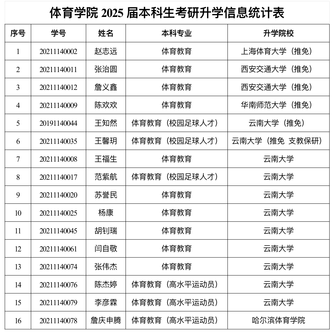 墨研千卷学风劲,鹏举九天捷报连。在刚刚结束的2025年考研升学季中,pp电子官方网站交出了一份亮眼成绩单,本科毕业生升学率达21.05%,较去年增长3.33个百分点,实现连续4年稳步提升,其中,报考本校研究生比例达91.07%。升学学生中,被双一流高校和体育专业院校录取比例达到100%,在云南省高校体育专业中位于前列。这一成绩不仅刷新了学院纪录,更展现了体院学子在学业与竞技双赛道上的较大潜力。