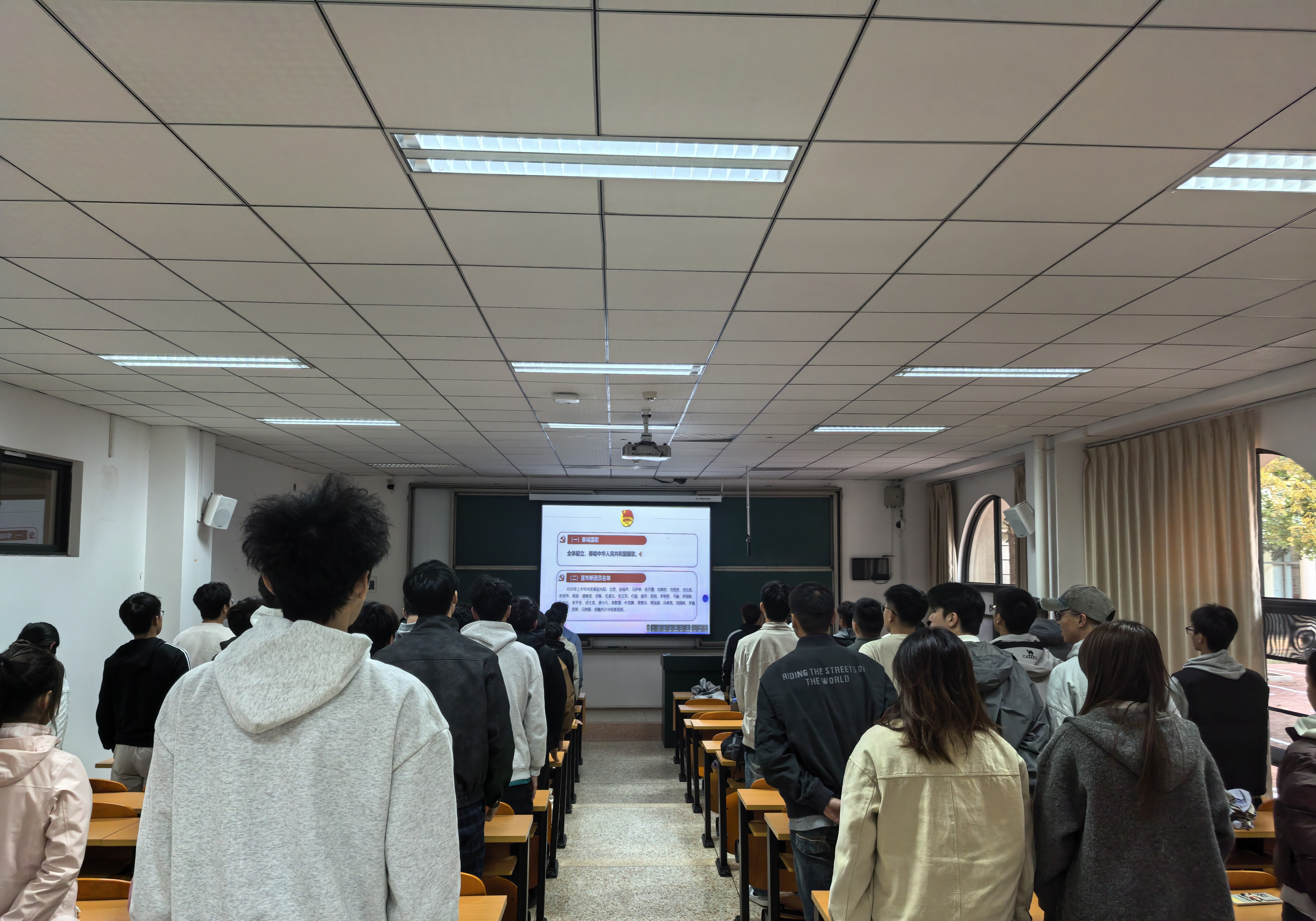 全体人员肃立高唱国歌,入团仪式正式开始。袁老师宣读新发展团员名单,共有35名同学光荣加入中国共产主义青年团,在其带领下,全体新团员右手握拳、举过头顶,面向团旗庄严宣誓。袁老师代表学院团委,对新团员提出三点希望:坚定理想信念、勤奋学习实践、锤炼高尚品格。最后,全体人员齐唱团歌,入团仪式圆满结束。