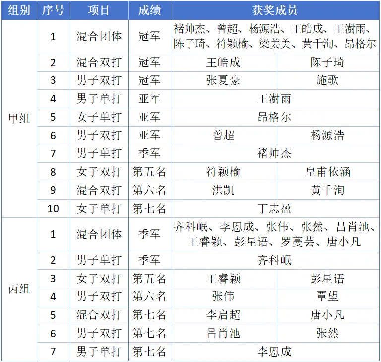 在本次赛事中,pp电子官方网站共派出27名队员参赛,整体发挥出色,几乎全员都斩获成绩。球队在团体赛和单项赛中全面开花,共荣获三金三银三铜的优异成绩。其中,甲组代表队继去年夺得男团、女团冠军后,今年再度获得混合团体冠军;在单项赛事上,男双包揽冠亚军,混双项目成功卫冕,男单获得第二、第三名,女单摘得第二名,并取得多个单项优秀名次。丙组代表队同样表现亮眼,斩获混合团体第三名、男单第三名及多个单项优胜奖项,实现了新的突破。