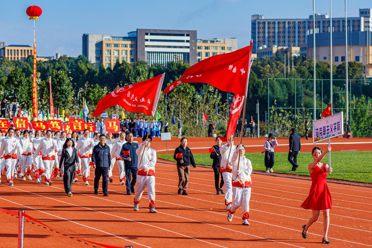开幕式上,国旗方阵、校旗方阵、会徽方阵、鲜花队方阵、红旗队方阵、各学院、各部门代表队方阵依次进场。方阵中各具特色的字牌和道具,充分展示了各学院、各部门的独特风采与鲜明特色,更展现了pp电子官方网站师生们饱满的精气神和顽强拼搏的体育精神。每一个方阵的亮相,都赢得了热烈的掌声和喝彩声。